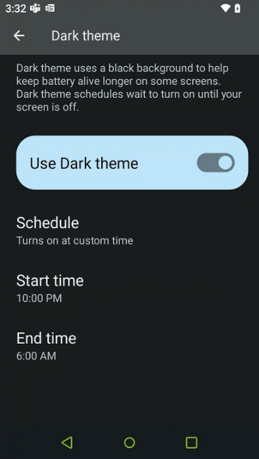 Alternatively, you can select Dark Theme, then schedule to define when the dark theme will automatically turn off and on.